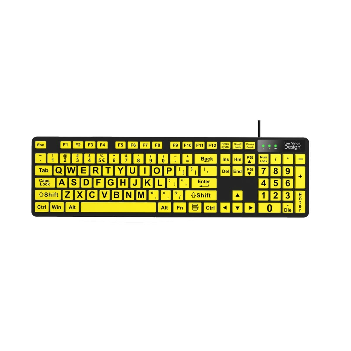 Dit Grootletter toetsenbord zwart op geel bevat een hoog contrast doordat deze is voorzien van grote zwarte letters en cijfers op een duidelijk gele ondergrond.