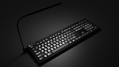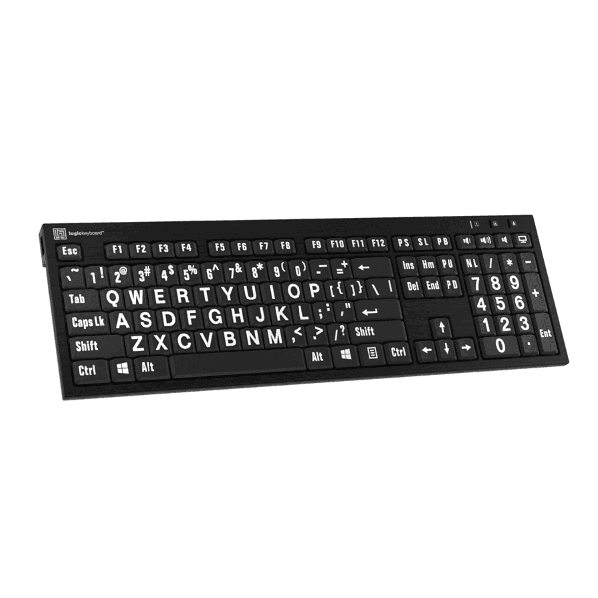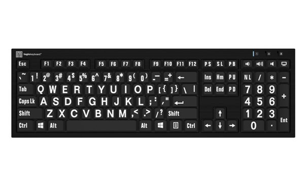 Het Toetsenbord Nero wit op zwart is een ideaal toetsenbord voor iedereen die graag comfortabel en foutloos wil typen. Dankzij de extra grote en duidelijk contrasterende toetsen met witte letters op zwarte achtergrond is dit toetsenbord uitermate geschikt voor mensen met een visuele beperking, verminderd zicht of gewoon voor wie meer overzicht en rust wil tijdens het typen. Daarnaast wordt er een LED lampje meegeleverd die u eenvoudig in de USB-aansluiting van het toetsenbord steekt. Dit zorgt voor nog meer contrast.